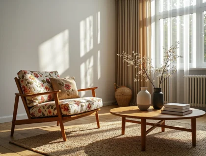 - Fotele akcentujące: Jeśli preferujesz, aby główna sofa pozostała w stonowanym, na przykład beżowym lub jasnoszarym kolorze, możesz pozwolić sobie na szaleństwo przy wyborze foteli. Musztardowy, rdzawy lub szmaragdowy fotel uszak (bądź model w kształcie muszli) osadzony na nowoczesnych, cienkich metalowych nóżkach to prawdziwy strzał w dziesiątkę.
